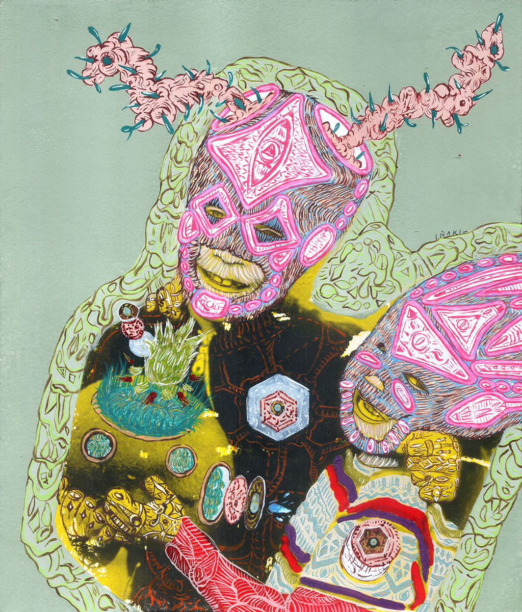 “DIPTICO ESCENAS MOLECULARES REPLETAS DE ATOMOS MAGICOS Y CURTIDOS”. Traspaso de imagen + Acrílico + marcador permanente sobre cartón couche. 17 x 20 cm. 2006 – 2012