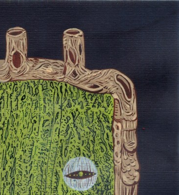 DETALLE DE OBRA. “ESPIRITU DE HUMEDAD DE DESEOS, CON PIEL DE CORTEZA, TALLADA EN FANTASIAS INVERTIDAS”. Acrílico + Tinta China + marcador sobre papel negro. 12 X 17 cm. 2012