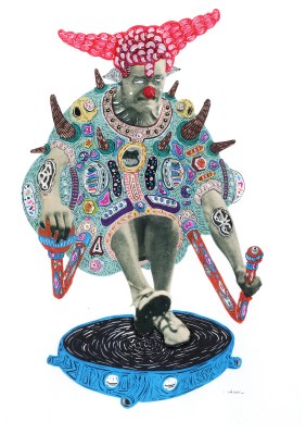 “SERIE LA INVERTIDA POSICION DE LA GALAXIA ENTRE CUERPOS INVISIBLES Y ORGANOS VISIBLE MENTE SENSIBLES”. Acrílico + Marcadores permanente + Tinta china interviniendo imagen sobre cartón espuma. 21 x 31 cm. 2012