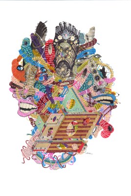 “SERIE LA INVERTIDA POSICION DE LA GALAXIA ENTRE CUERPOS INVISIBLES Y ORGANOS VISIBLE MENTE SENSIBLES”. Acrílico + Marcadores permanente + Tinta china + Collage, sobre cartón espuma. 21 x 31 cm. 2012