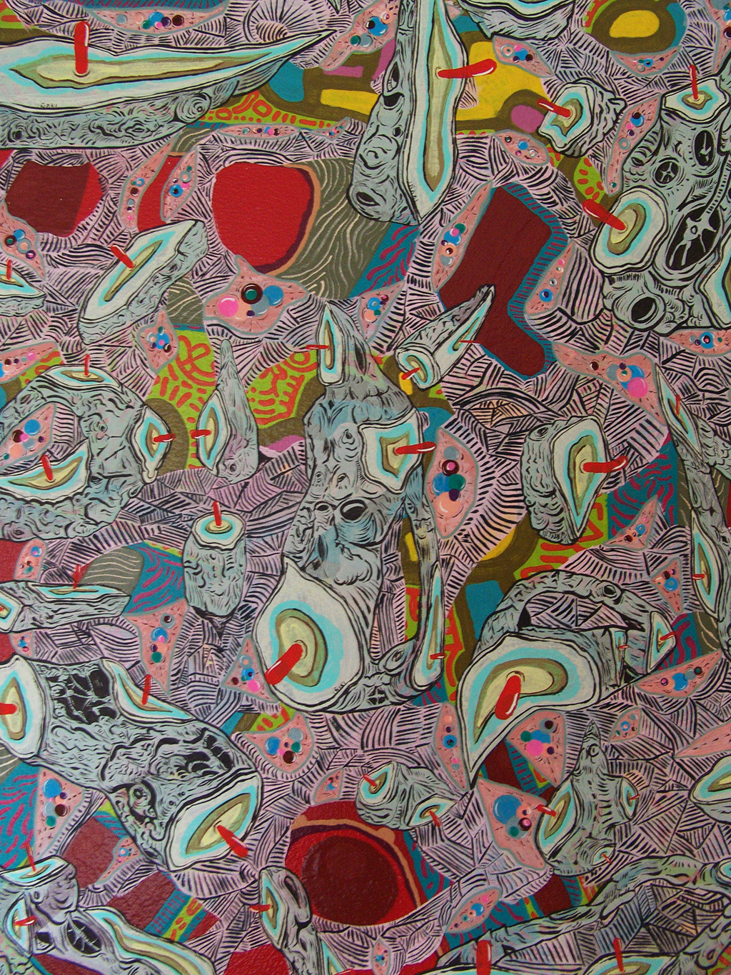 DETALLE DE OBRA. “LA PEQUEÑA PARTICULA DE UN LUGAR, REPLETO DE CONOCIMIENTOS LEGITIMOS, RELEVANTES Y MAGICOS”. Acrílico + Esmalte al agua sobre tela. 70 x 50 cm. 2009 – 2012