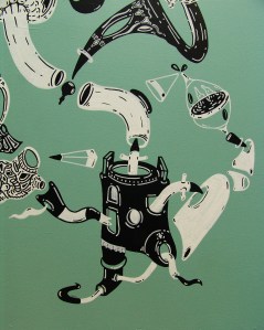 DETALLE DE OBRA. “DIPTICO DIMENSIONES Y CONCEPTOS MUNDIALES SOBRE LO IMPOSIBLE”. Esmalte al agua + Acrílico sobre madera. 1 x 1 mt. 2013