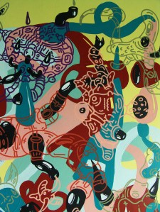 DETALLE DE OBRA. “SERIE PUERTAS DINAMICAS PARA LABERINTOS CON SALIDA CIRCULAR”. Esmalte al agua + acrílico sobre madera. 60 x 175 cm. 2013