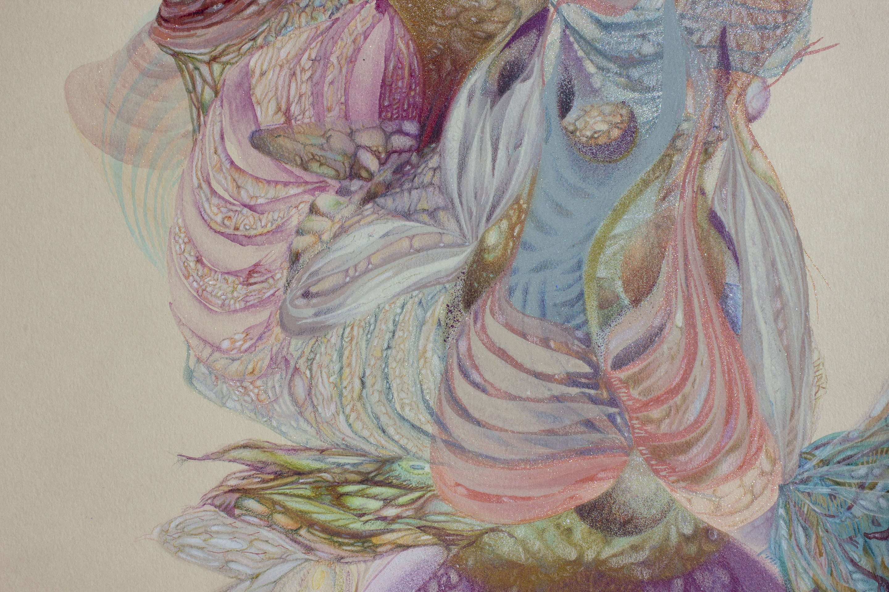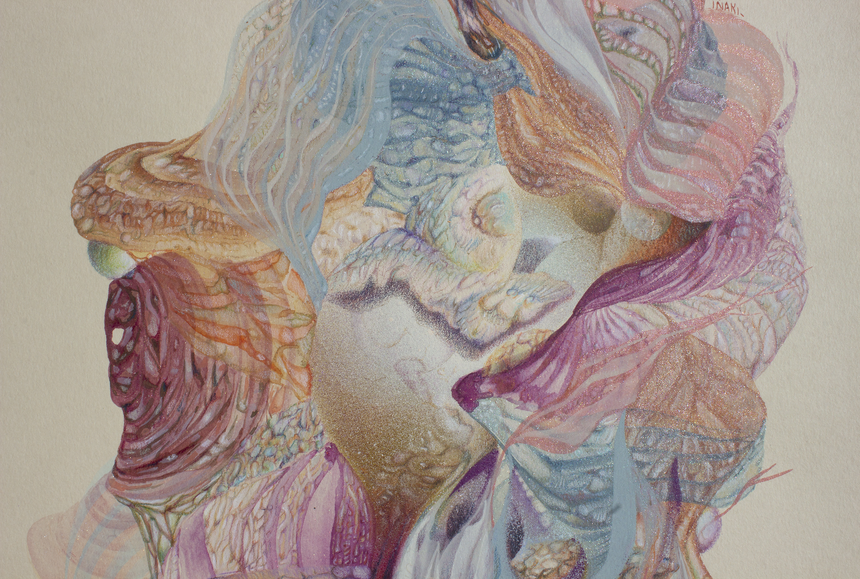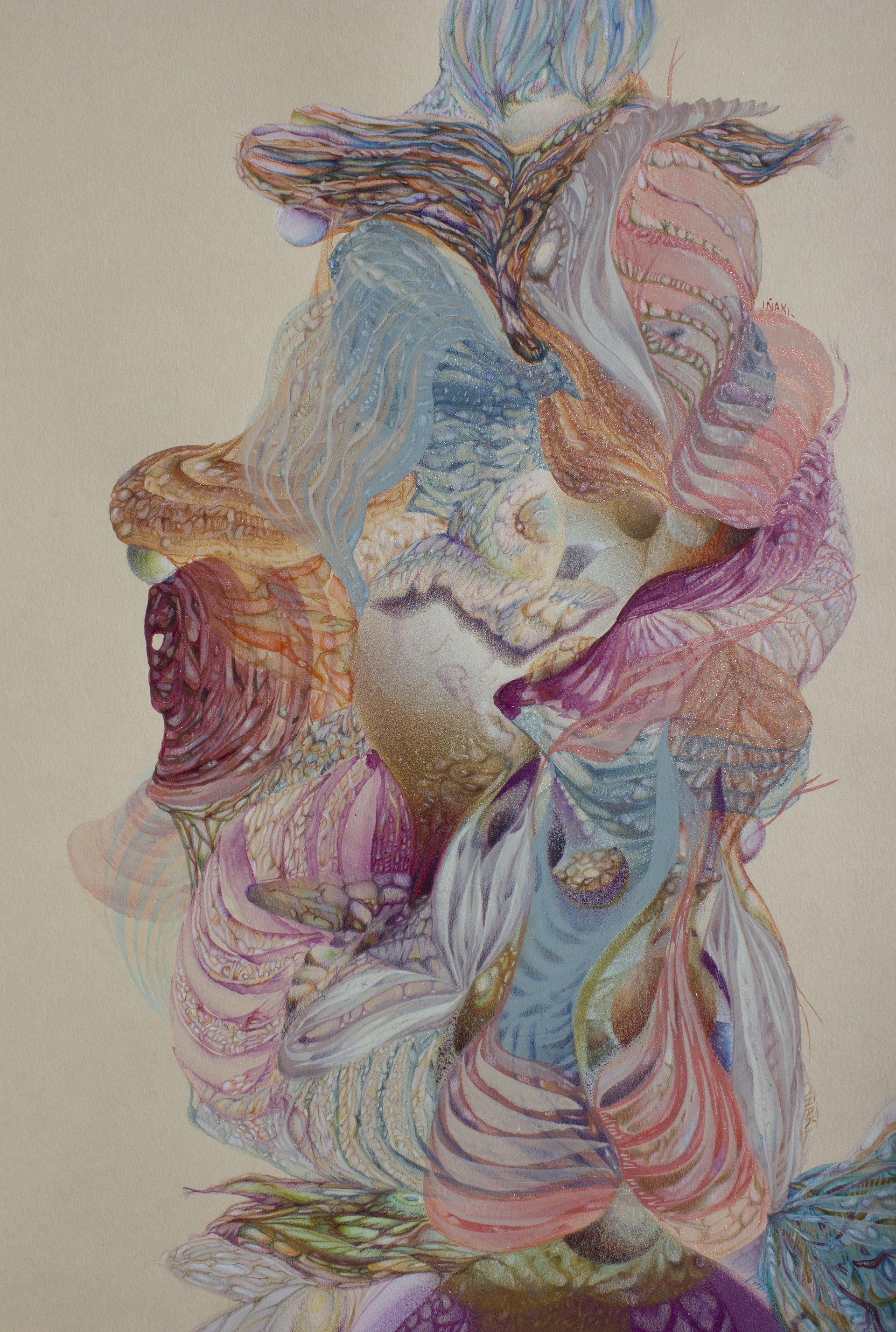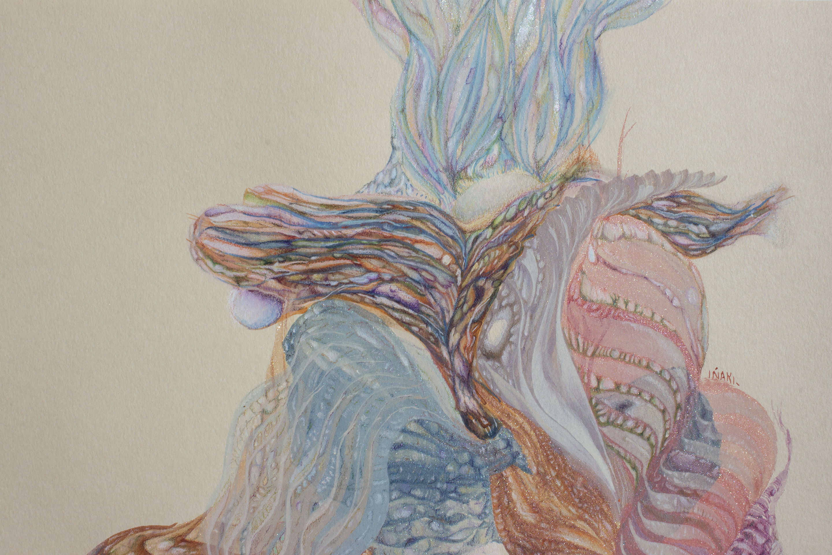 Lápiz color, acuarela, gouache, spray acrílico sobre papel clairefontaine, 250 gr.