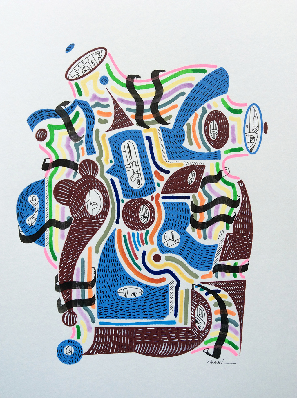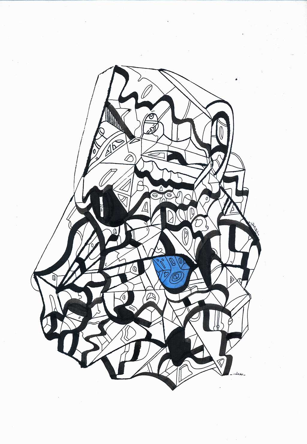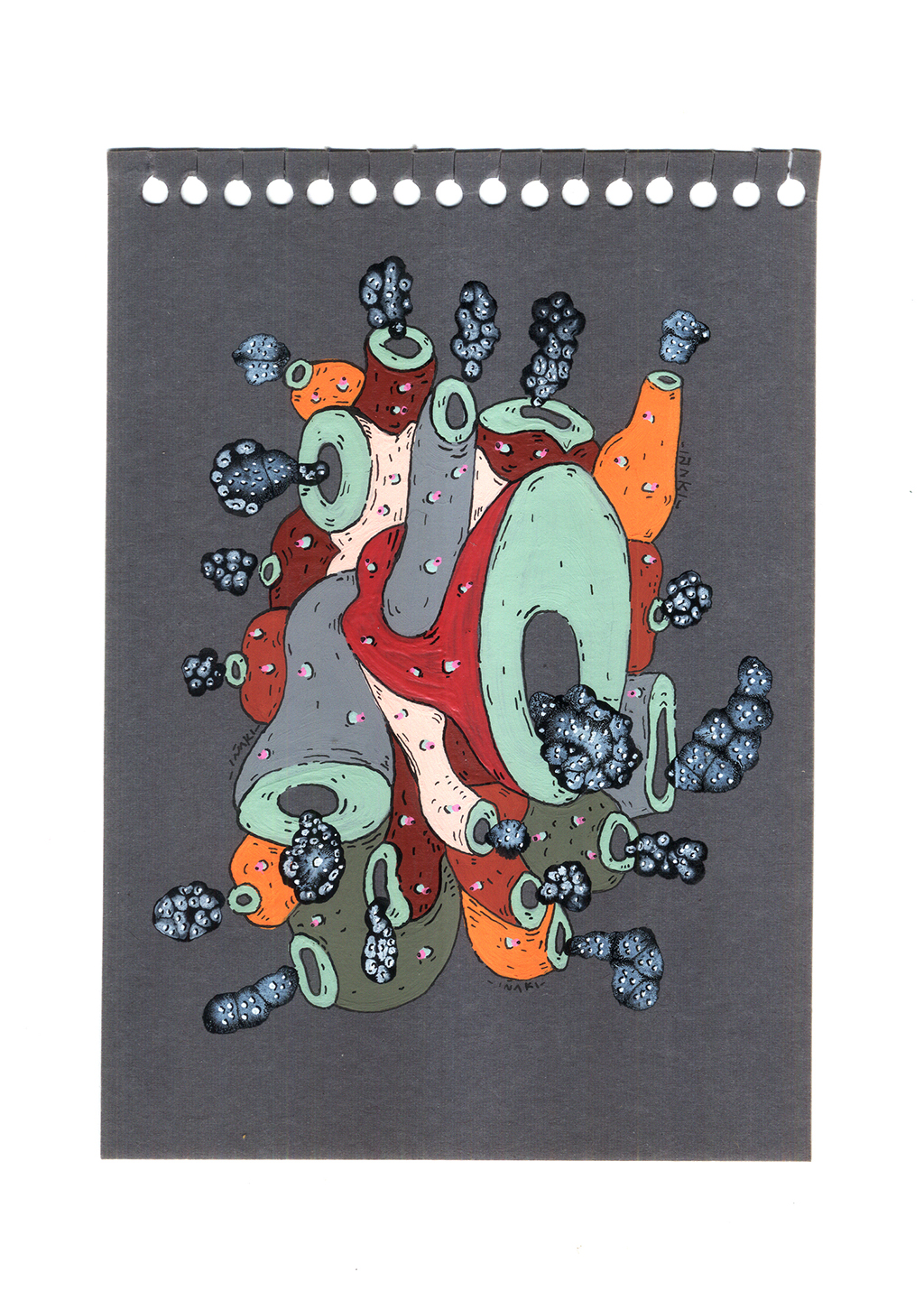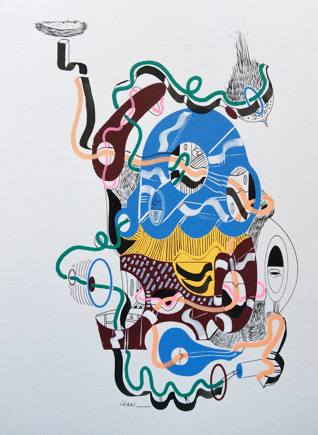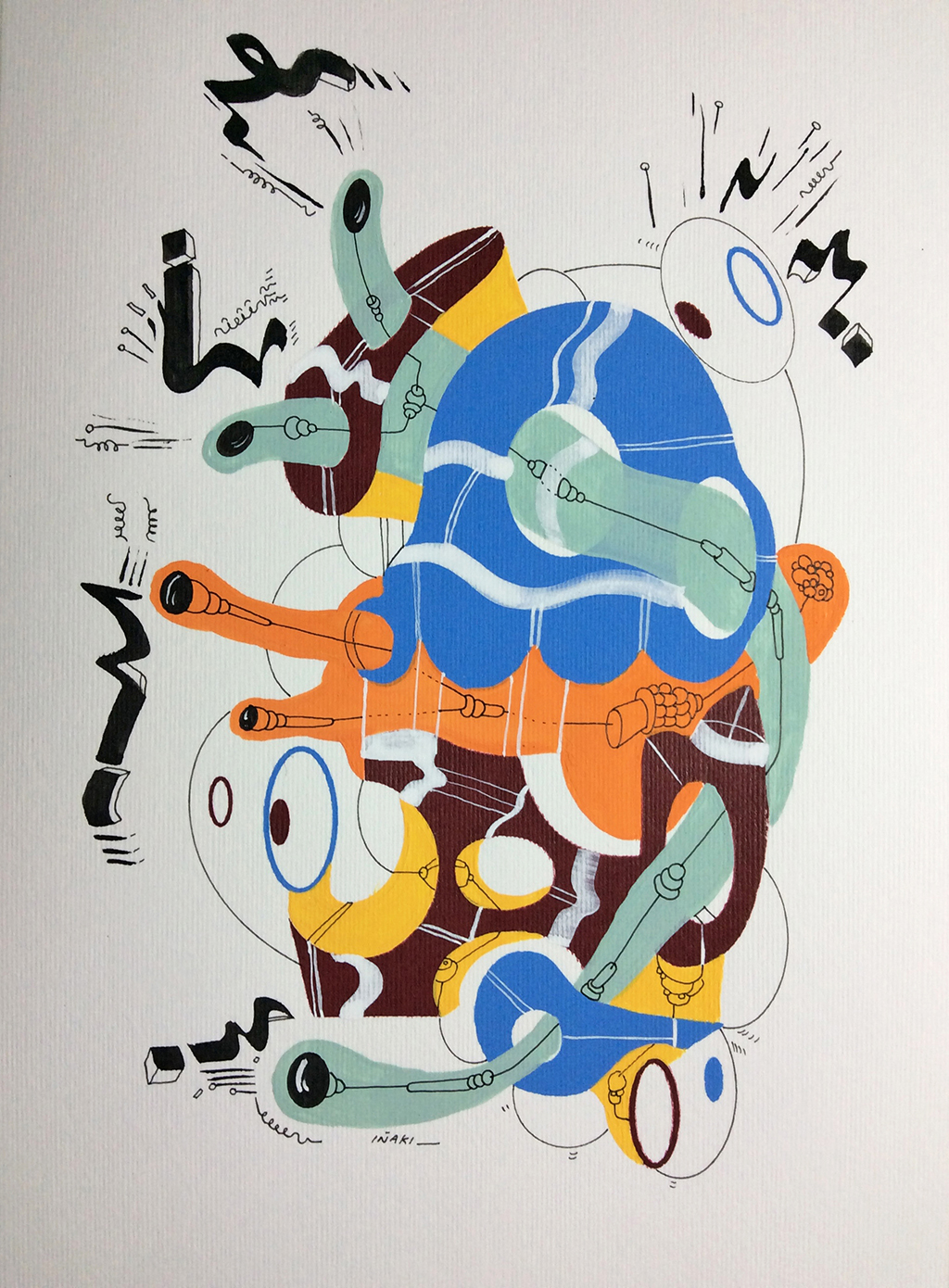 Acrílico, tinta china, marcadores al oleo sobre papel cansón. 21 x 29 cm