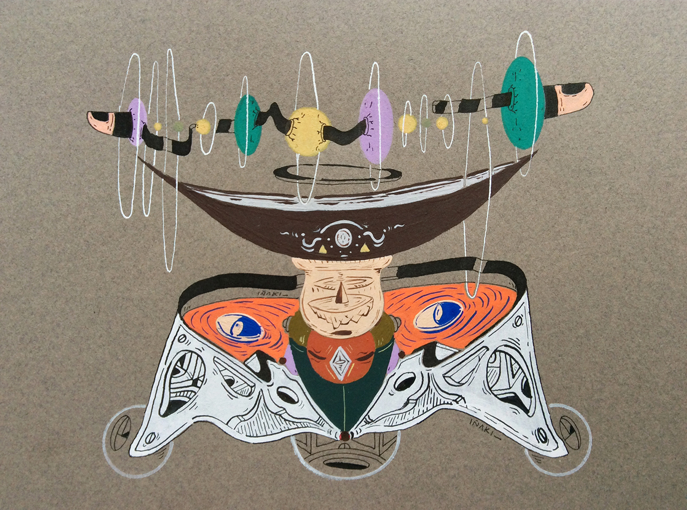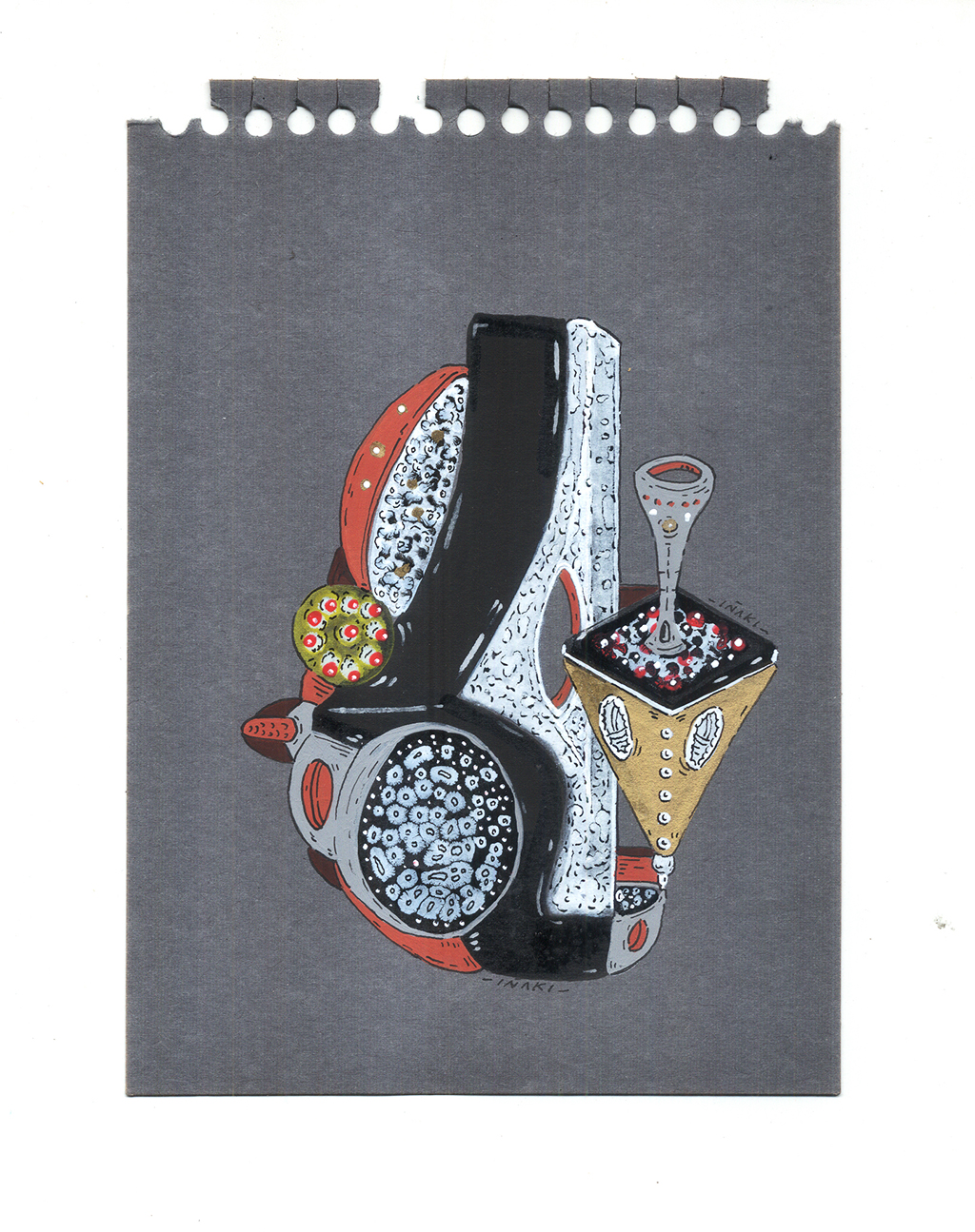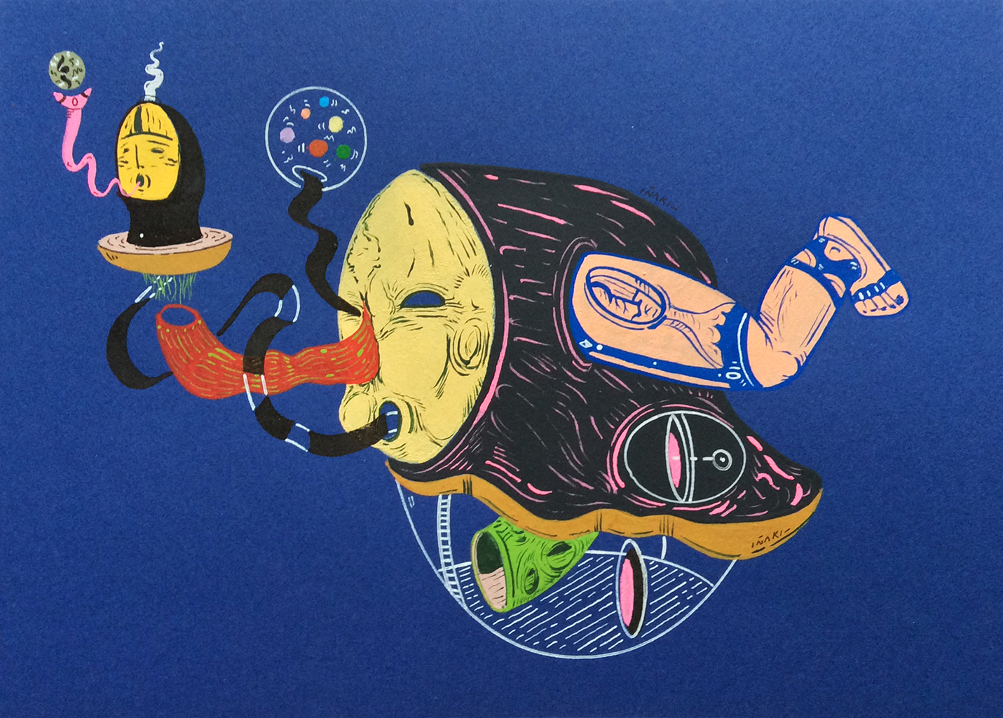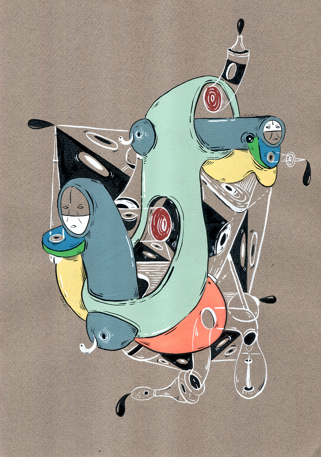 Acrílico, tinta china, marcadores al oleo sobre papel cansón. 21 x 29 cm