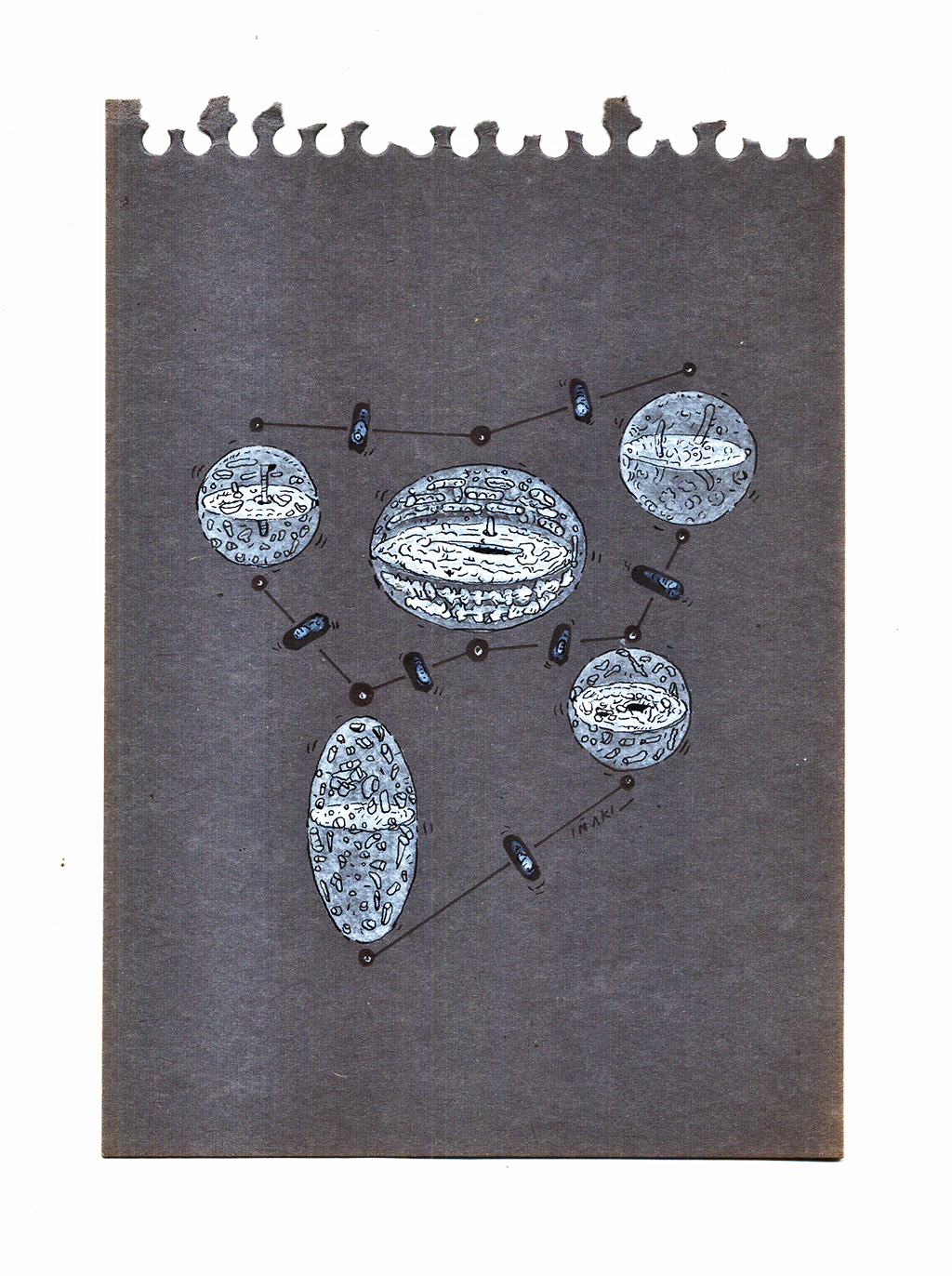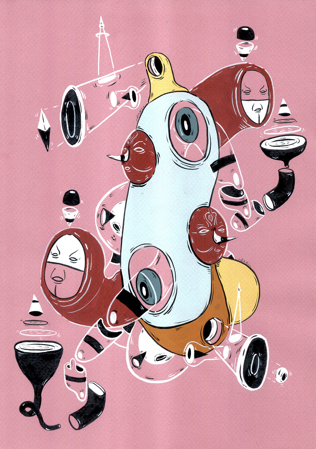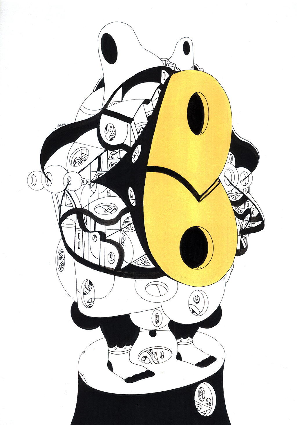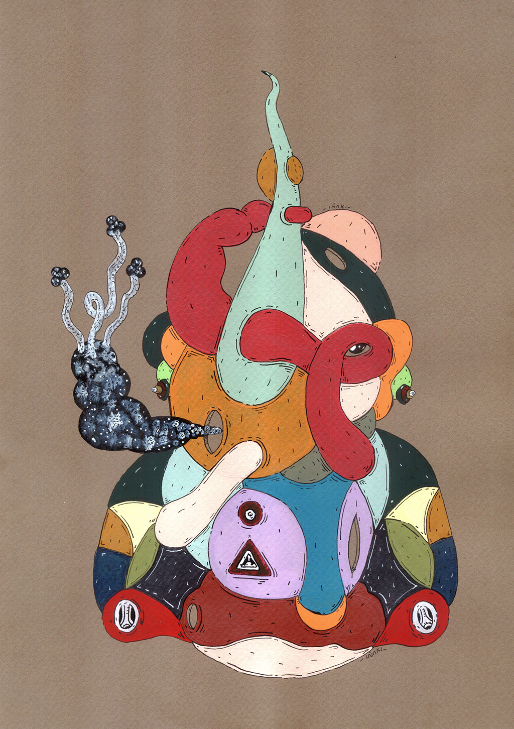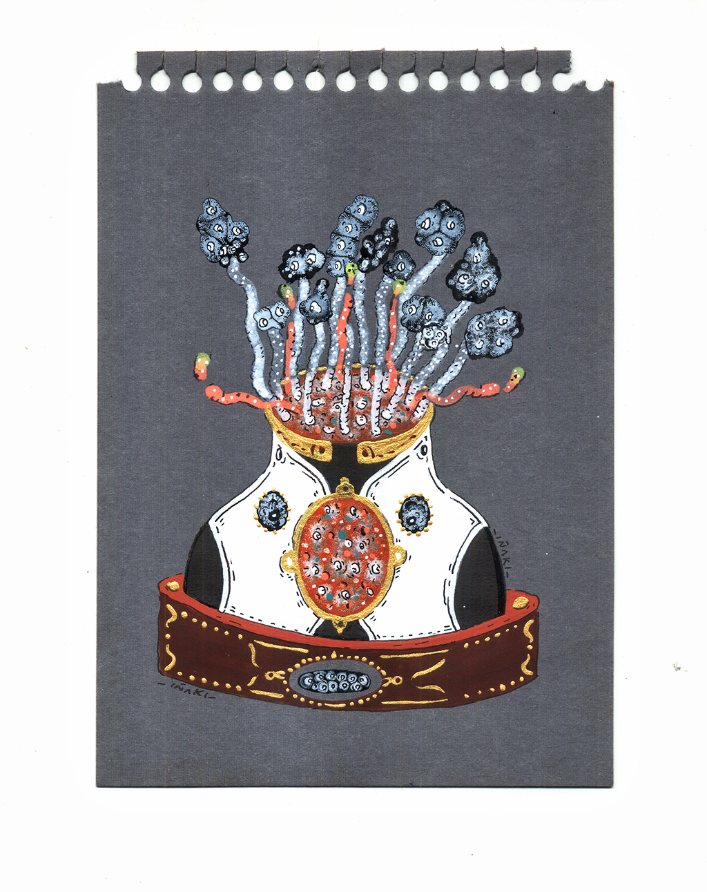 Acrílico, tinta china, marcadores al oleo sobre papel cansón. 21 x 29 cm
