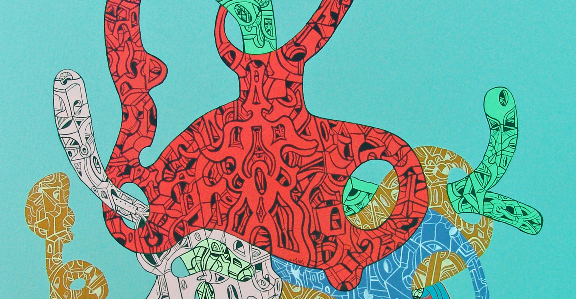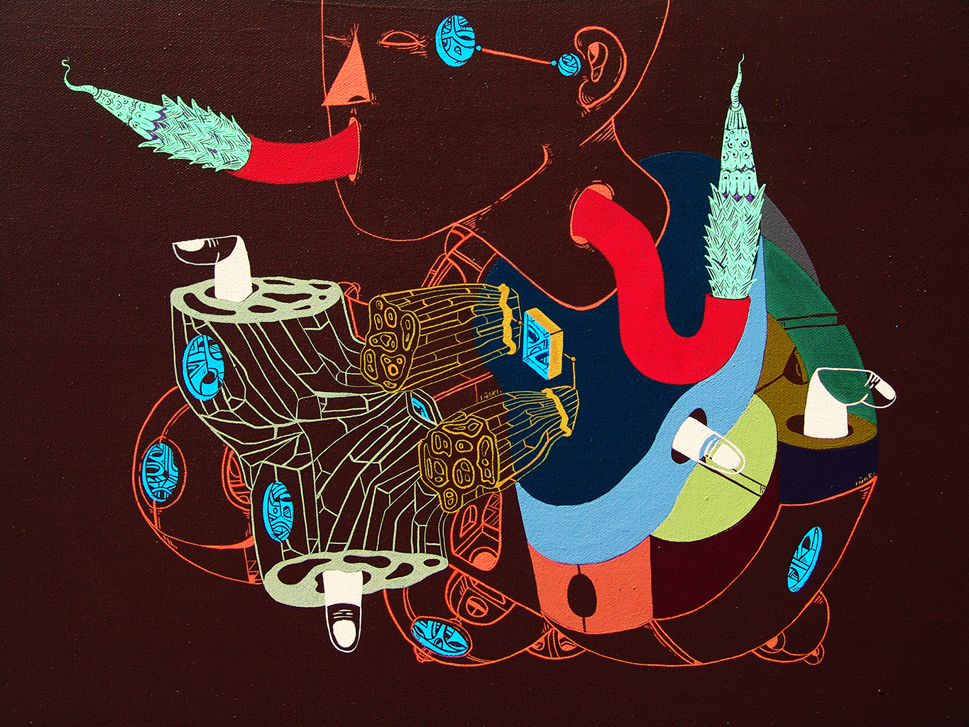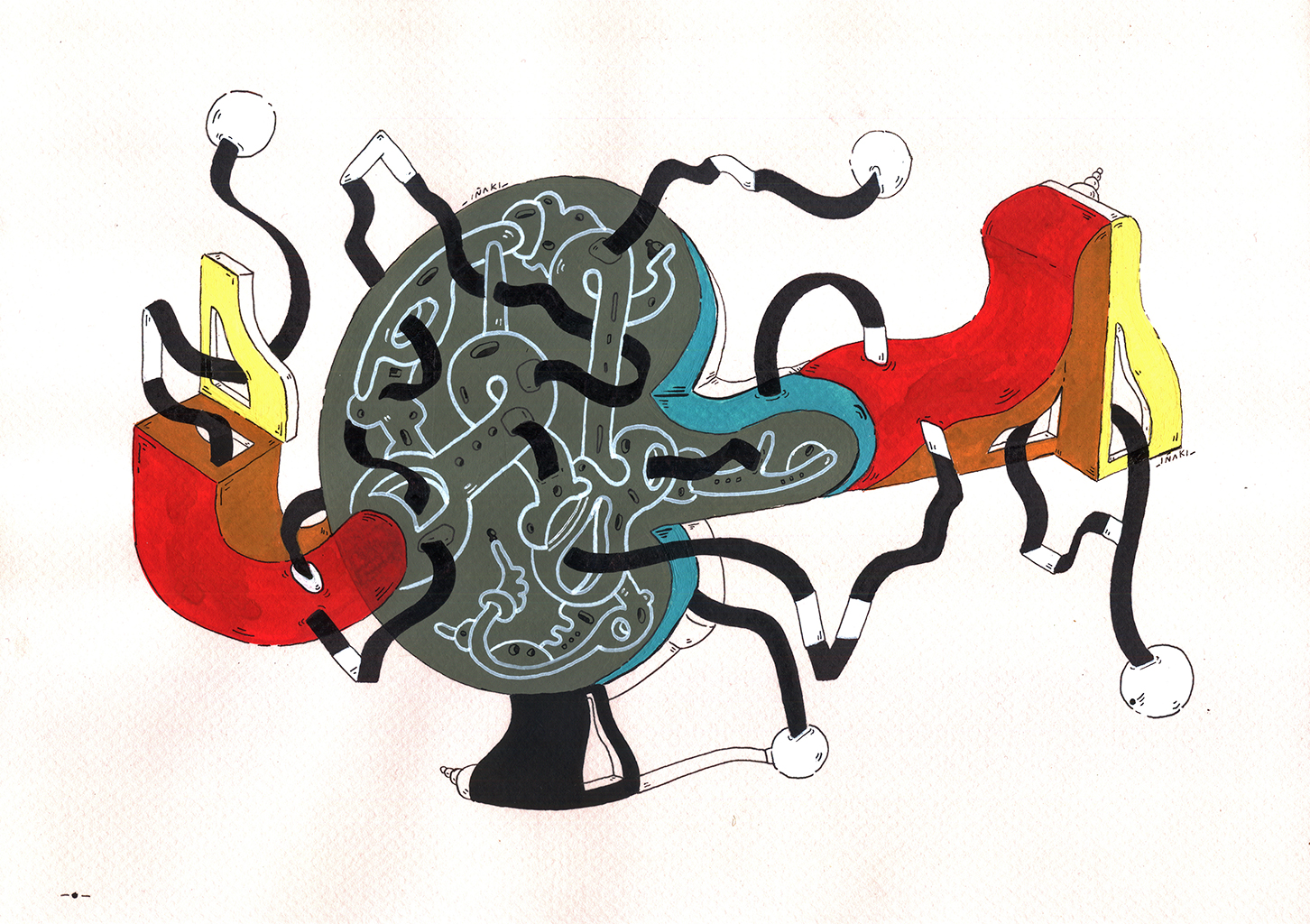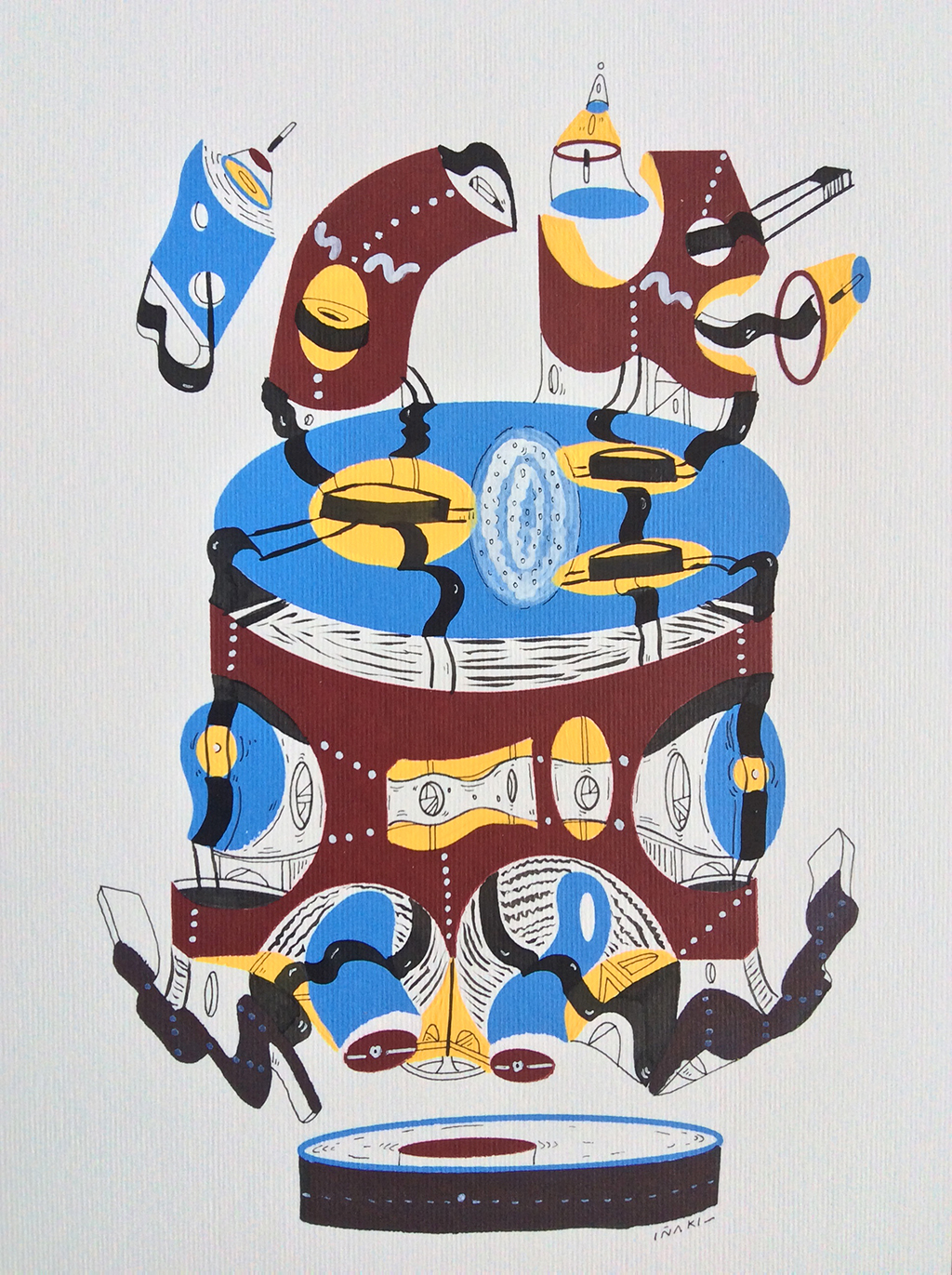 Acrílico, tinta china, marcadores al oleo sobre papel cansón. 21 x 29 cm