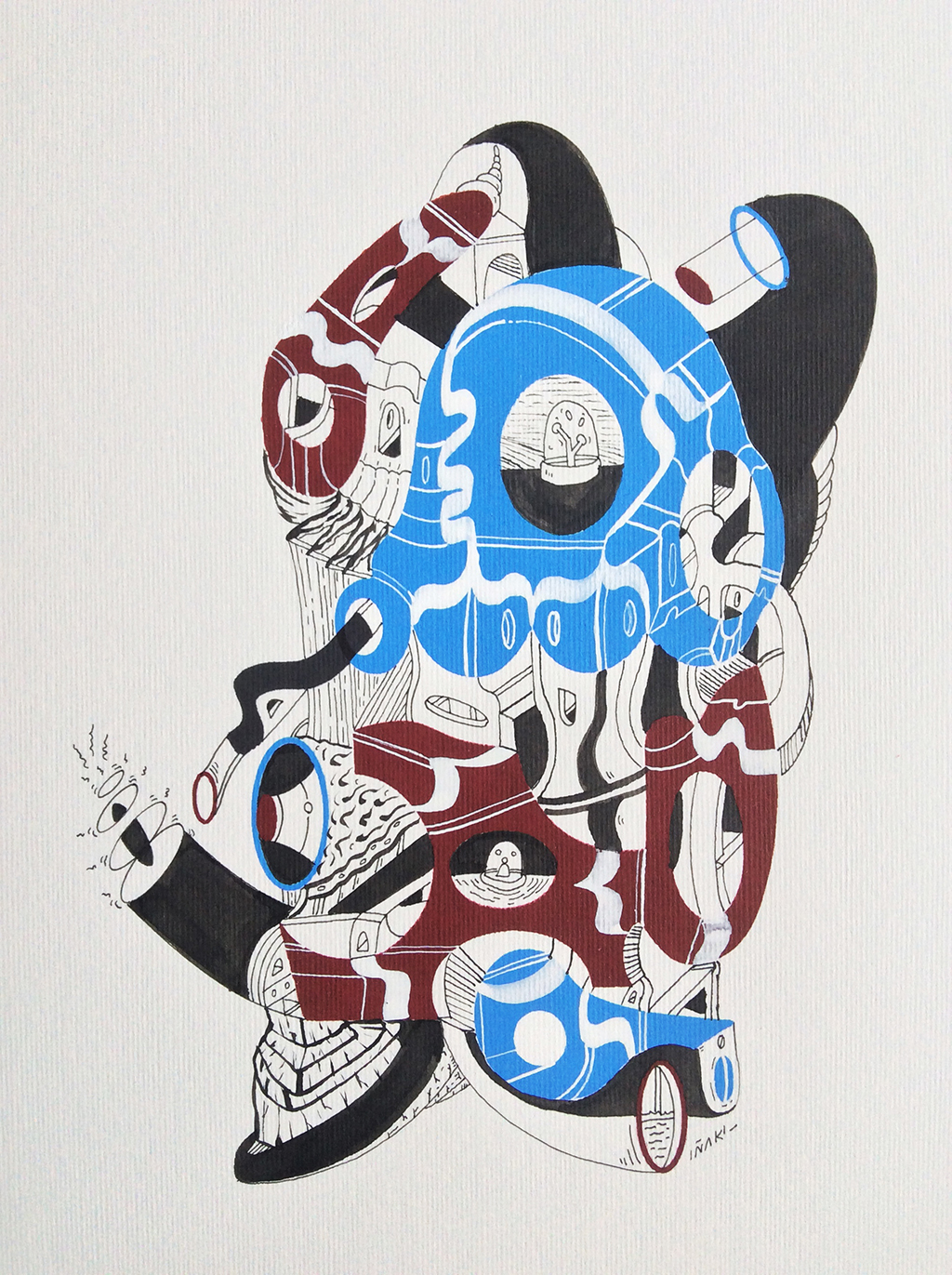 Acrílico, tinta china, marcador al oleo sobre papel cansón. 21 x 29 cm