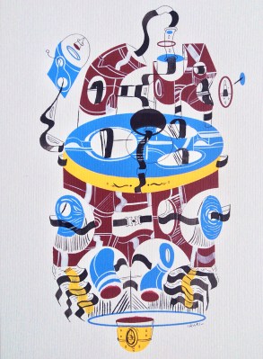 “SERIE LA INUNDACIÓN DE DIÁLOGOS Y POSIBILIDADES”. Serigrafía + acrílico + tinta china + marcadores permanentes sobre papel. 18 x 24 cm. 2014