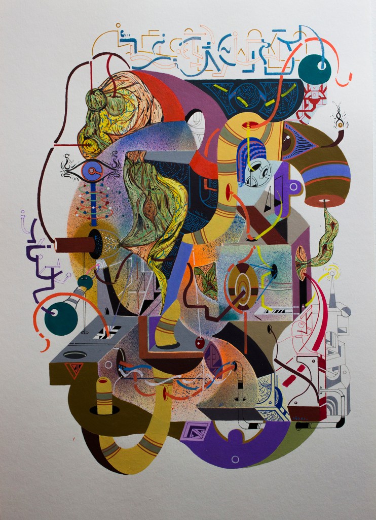 Acrílico (Spray, pincel y pluma), marcador permanente y tinta acrílica sobre papel Bamboo Hahnemuhle de 265 gr. 34,9 x 49,9 cm. 2018